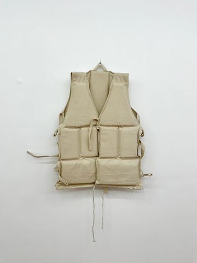 The exhibition also features a raw canvas life vest, a sculptural work blurring the boundaries between painting and objecthood. Serving as both literal flotation device and metaphor for survival, it resonates with the exhibition’s title, exploring tensions between safety and vulnerability, presence and disappearance.