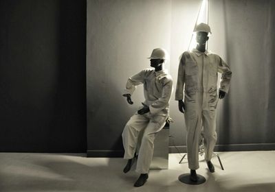 The exhibition speaks to this historical moment and restages it across a range of devices that transpose the said narrative or event and its effects. A beguiling scenography thus is created, animated by remixed music of ritual chant and electronic drone, sprawling painting, enigmatic text, costume, museum memorabilia and furniture, and the pervasive tint of blue from both fluorescent and decal. The artist performs diverse roles in making all this happen: researcher, production designer, creative director, music mixer, painter. In this heady ensemble, the tale of the Filipino seafarer named Kerel is inevitably evoked, a traveler across time zones, mired in the fine grain of work, in the silhouette of structure, in a world of water.